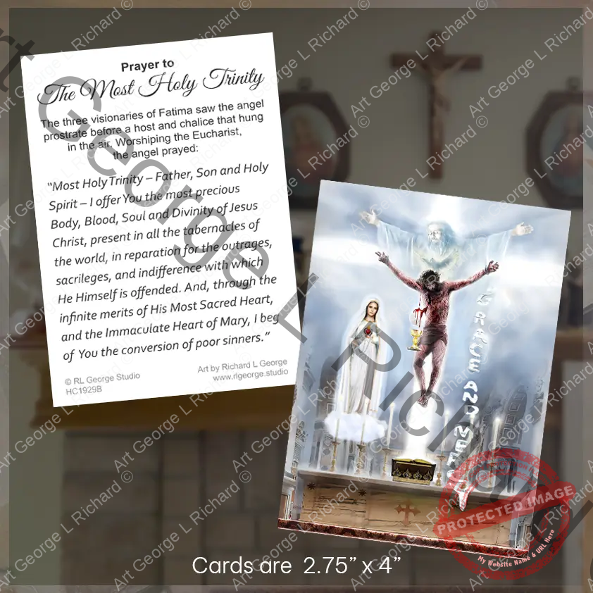 The Most Holy Trinity Holy Card – Prayer Card Front features art by Richard L George and the Back of the Prayer Card features the Prayer of the Angel before the Most Blessed Sacrament at Fatima.