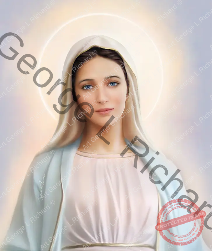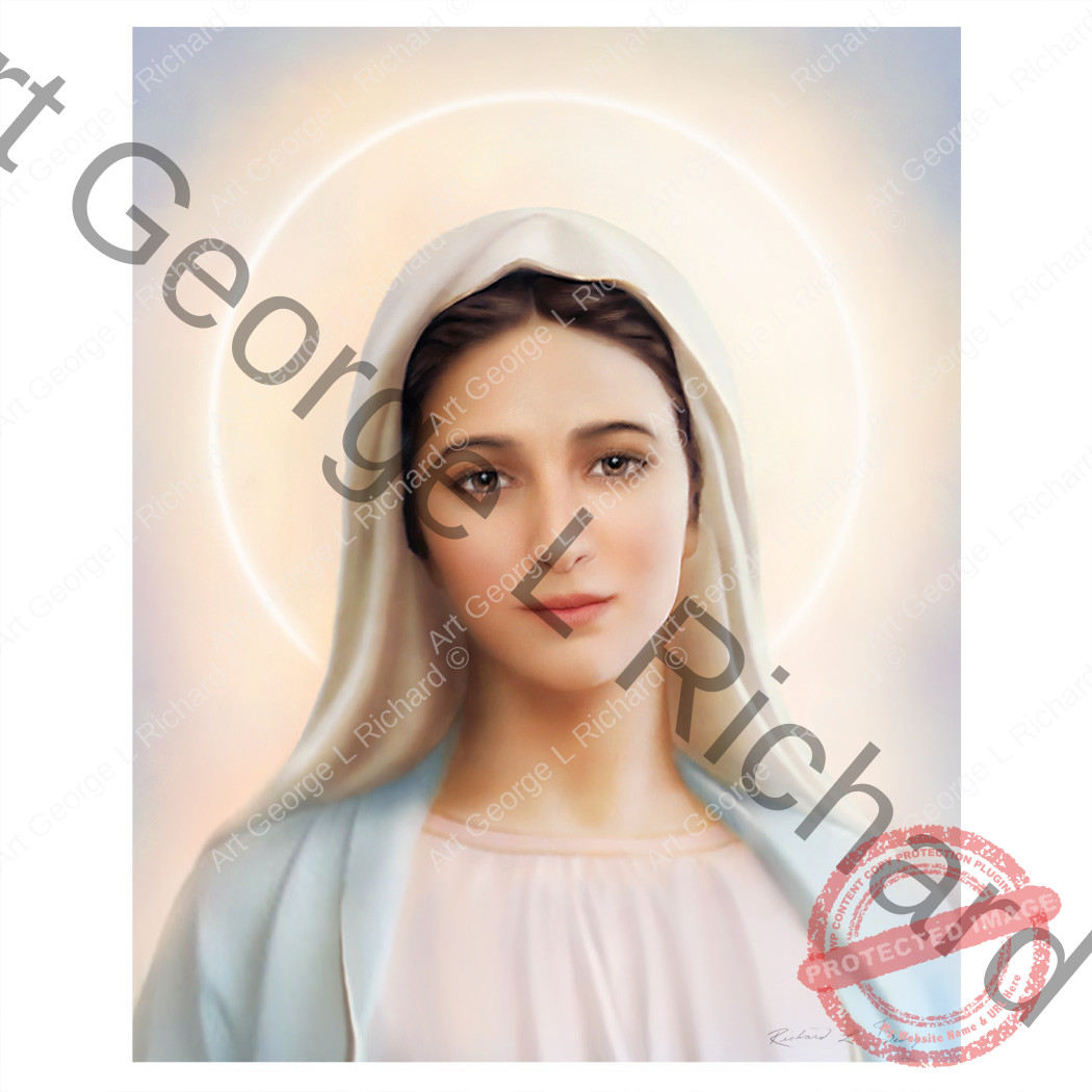 I pray this image of Mother Mary will help you better realize Her love for you and be a help for you to remain ever close to Her Immaculate Heart in prayer. – Catholic artist Richard L George